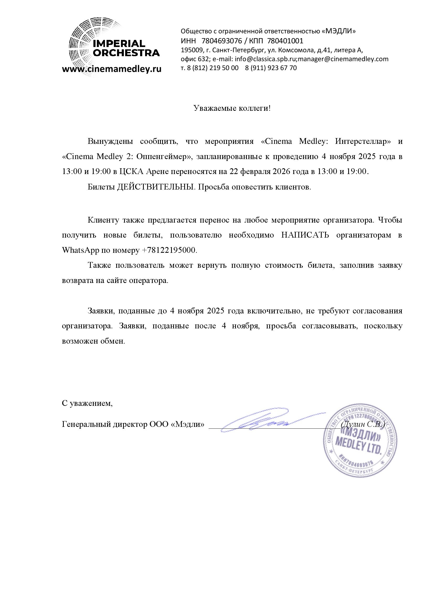 Уважаемый клиент! Спешим сообщить, что по информации, полученной от организатора, концерт «Cinema Medley 2: Интерстеллар», запланированный на 4 ноября 2025 года в 13:00 в ЦСКА Арена, перенесён на 22 февраля 2026 года, начало в 13:00. Ранее приобретенные билеты действительны на новую дату, обменивать их не нужно. Если вам не удобно посетить мероприятие в новую дату, вы можете вернуть билет по кнопке в личном кабинете во вкладке «Заказы» (до 4 ноября 2025 года). Деньги за электронные билеты вернутся автоматически в полном объёме на карту, с которой была произведена оплата. Если вы купили билет в кассе Ticketland.ru за наличный расчет, то обратитесь, пожалуйста, на почту: vozvrat@ticketland.ru. Письмо от организатораС уважением, команда поддержки Ticketland