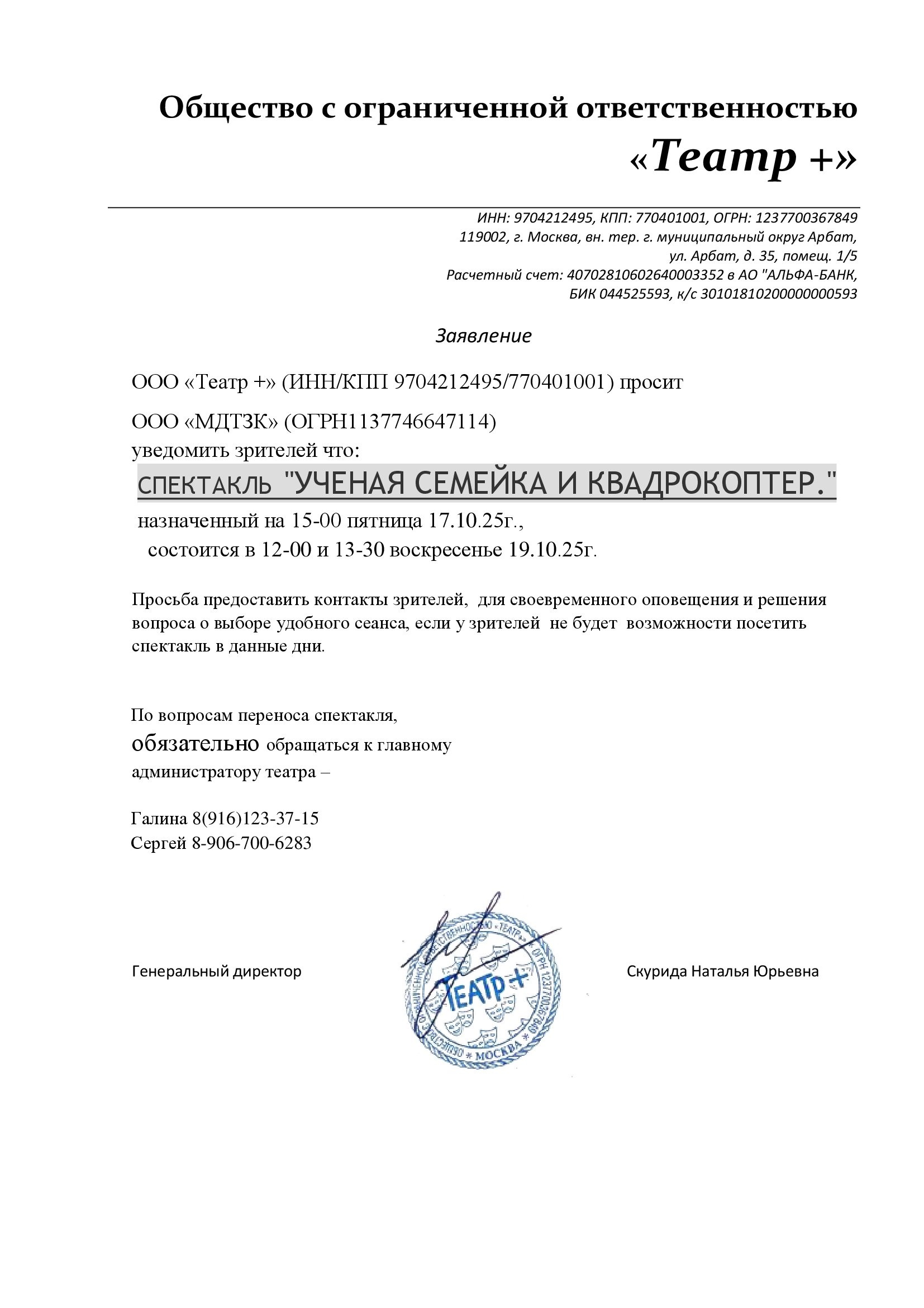 Уважаемый клиент! Спешим сообщить, что по информации, полученной от организатора, спектакль «Ученая семейка и квадрокоптер», запланированный на 17 октября 2025 года 15:00 в Центральном доме актера, перенесен на 19 октября 2025 года. Организатор предлагает выбрать любой из сеансов в этот день: в 12:00 или в 13:30. По всем вопросам обращайтесь, пожалуйста, к организатору по следующим контактным данным: Галина +7 (916)123-37-15, Сергей +7 (906) 700-62-83. С уважением, команда поддержки Ticketland