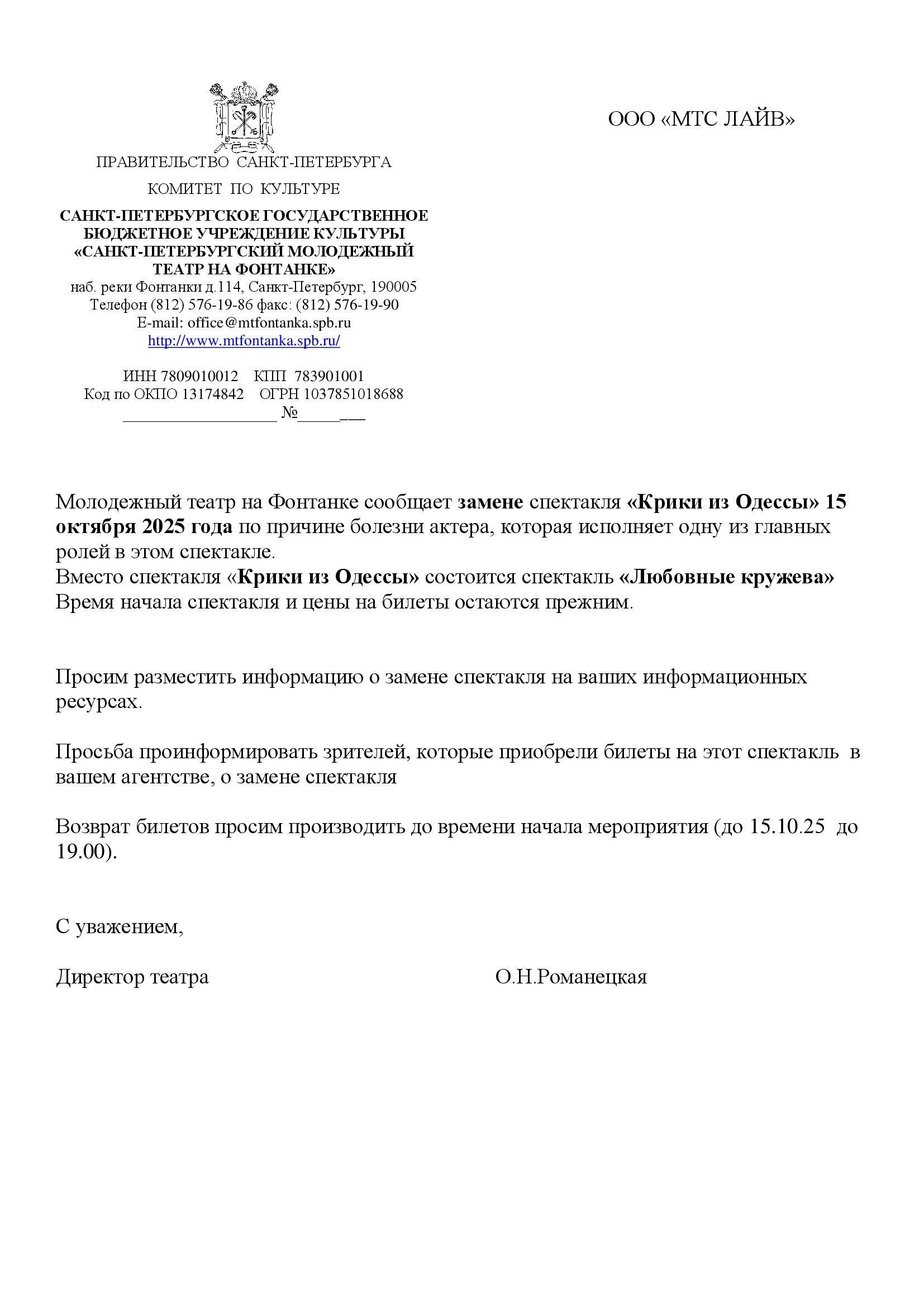 Уважаемый клиент! Спешим сообщить, что по информации, полученной от организатора, спектакль «Крики из Одессы», запланированный на 15 октября 2025 года в Молодежном театре на Фонтанке, заменен на спектакль «Любовные кружева». Ранее приобретенные билеты действительны, обменивать их не нужно. Если вы не хотите посетить новое мероприятие, вернуть билет можно по кнопке в личном кабинете во вкладке «Заказы» . Деньги за электронные билеты вернутся автоматически в полном объёме на карту, с которой была произведена оплата. Если вы купили билет в кассе Ticketland.ru за наличный расчет, то обратитесь, пожалуйста, на почту: vozvrat@ticketland.ru. С уважением, команда поддержки Ticketland