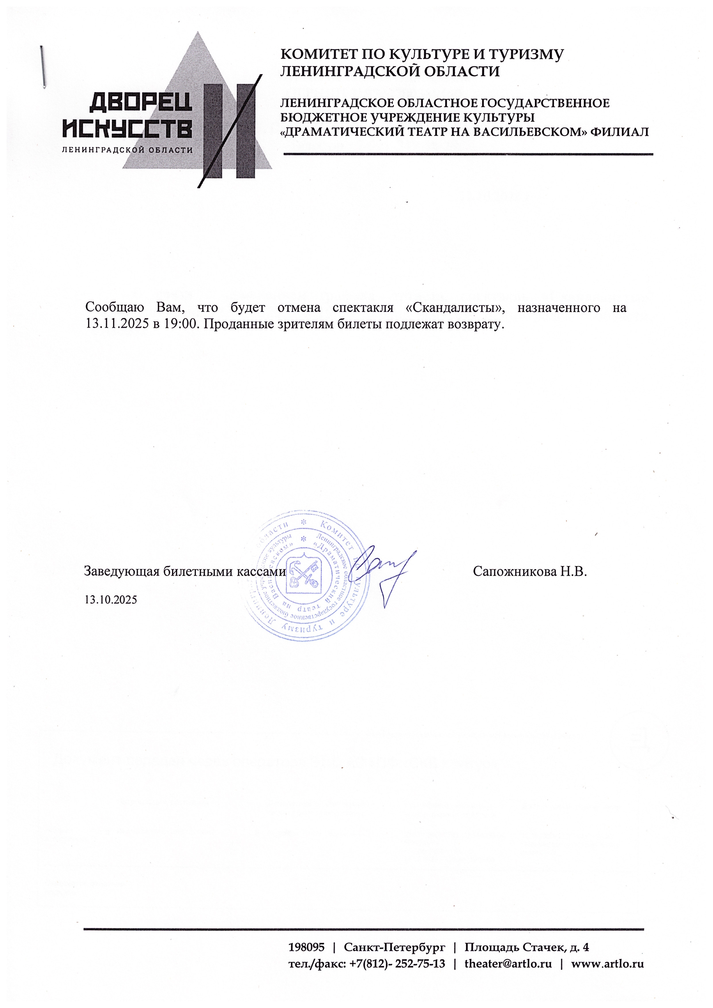 Уважаемый клиент! Спешим сообщить, что по информации, полученной от организатора, спектакль «Скандалисты» запланированный на 13 ноября 2025 года в 19:00 во дворце искусств Ленинградкой области, отменён. Деньги за электронные билеты вернутся автоматически в полном объёме на карту, с которой была произведена оплата. Если вы купили билет в кассе Ticketland.ru за наличный расчет, то обратитесь, пожалуйста, на почту: vozvrat@ticketland.ru. С уважением, команда поддержки Ticketland.