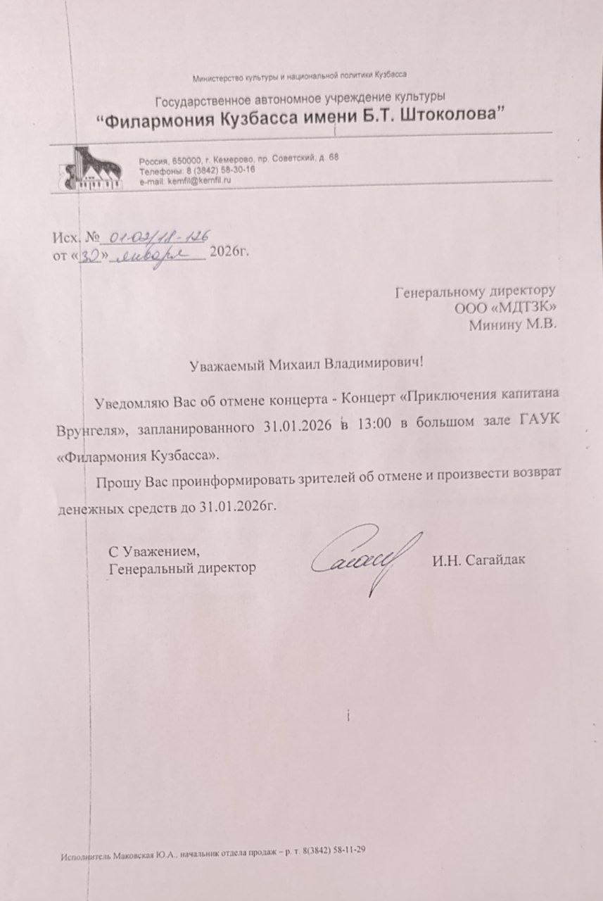 Уважаемый клиент! Спешим сообщить, что по информации, полученной от организатора, концерт «Приключения капитана Врунгеля», запланированный на 31 января 2026 года в 13:00 в Филармонии Кузбасса, отменён. Деньги за электронные билеты вернутся автоматически в полном объёме на карту, с которой была произведена оплата. Если вы купили билет в кассе Ticketland.ru за наличный расчет, то обратитесь, пожалуйста, на почту: vozvrat@ticketland.ru. С уважением, команда поддержки Ticketland.
