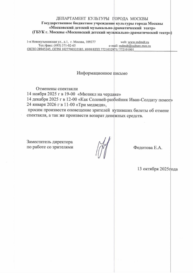 Уважаемый клиент! Спешим сообщить, что по информации, полученной от организатора, спектакль «Мюзикл на чердаке», запланированный на 14 ноября 2025 года в 19:00 в Московском детском музыкально-драматическом театре, отменен. Деньги за электронные билеты вернутся автоматически в полном объёме на карту, с которой была произведена оплата. Если вы купили билет в кассе Ticketland.ru за наличный расчет, то обратитесь, пожалуйста, на почту: vozvrat@ticketland.ru. С уважением, команда поддержки Ticketland