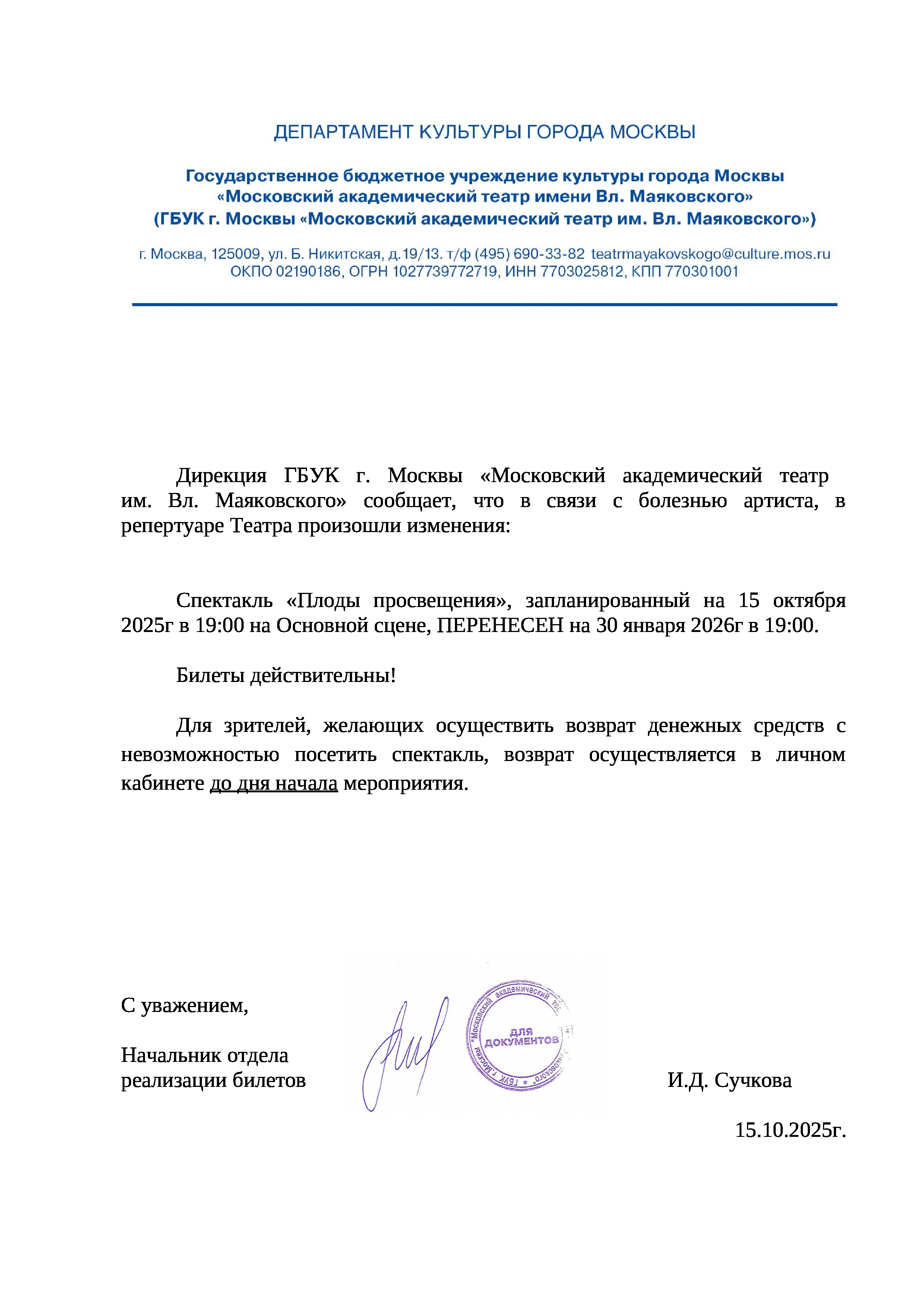 Уважаемый клиент! Спешим сообщить, что по информации, полученной от организатора, спектакль «Плоды просвещения», запланированный на 15 октября 2025 года в 19:00 в Театре им. Маяковского, перенесён 30 января 2026 года, начало в 19:00. Ранее приобретенные билеты действительны на новую дату, обменивать их не нужно. Если вам не удобно посетить спектакль в новую дату, вы можете вернуть билет по кнопке в личном кабинете во вкладке «Заказы» (до 29 января 2026 года до 19:00). Деньги за электронные билеты вернутся автоматически в полном объёме на карту, с которой была произведена оплата. Если вы купили билет в кассе Ticketland.ru за наличный расчет, то обратитесь, пожалуйста, на почту: vozvrat@ticketland.ru. С уважением, команда поддержки Ticketland.