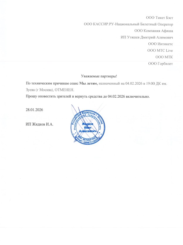 Уважаемый клиент! Спешим сообщить, что по информации, полученной от организатора, спектакль «Мы летим», запланированный на 4 февраля 2026 года в 19:00 в ДК имени Зуева, отменен. Деньги за электронные билеты вернутся автоматически в полном объёме на карту, с которой была произведена оплата. Если вы купили билет в кассе Ticketland.ru за наличный расчет, то обратитесь, пожалуйста, на почту: vozvrat@ticketland.ru. С уважением, команда поддержки Ticketland