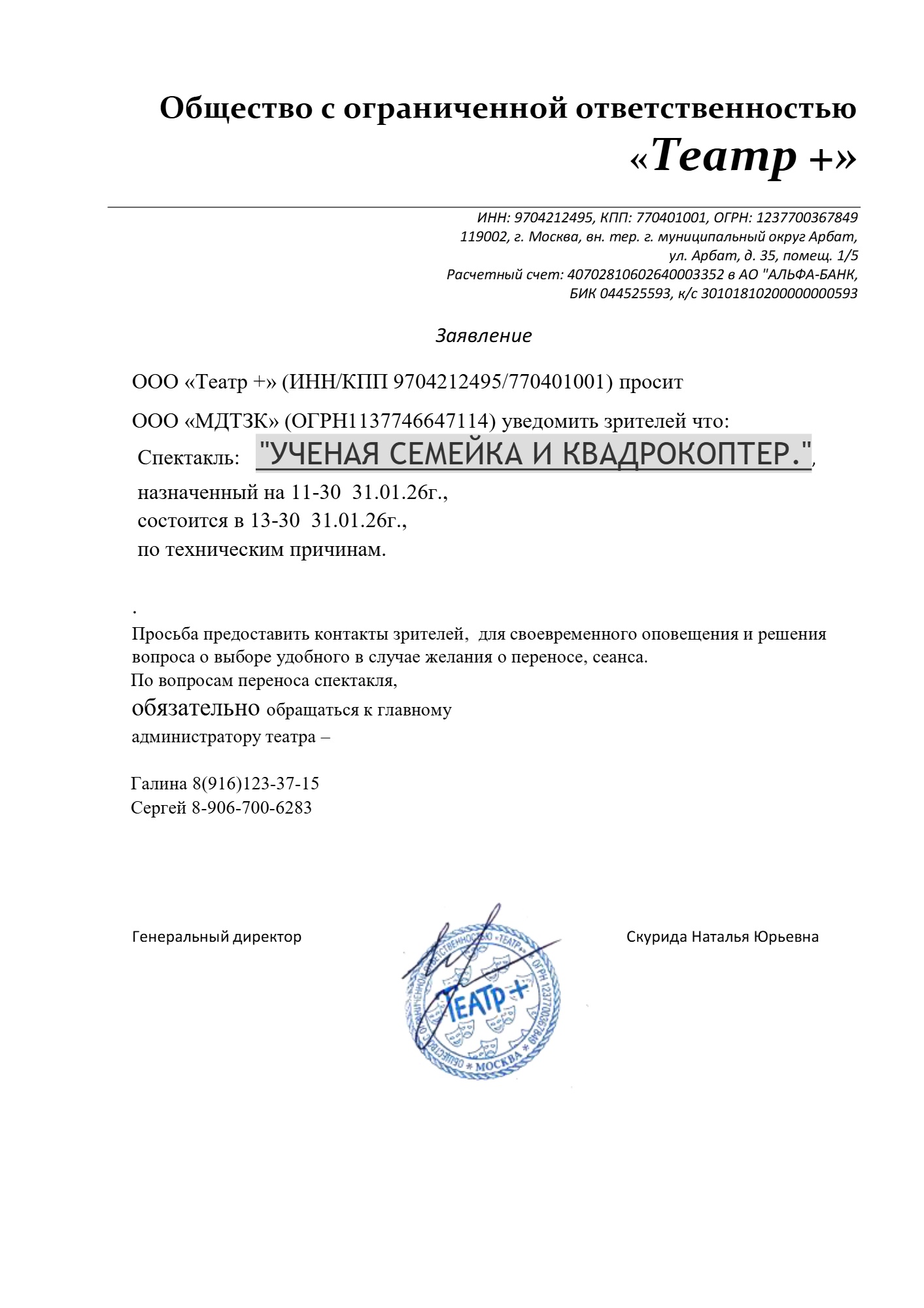 Уважаемый клиент! Спешим сообщить, что по информации, полученной от организатора, спектакль «Ученая семейка и квадрокоптер», запланированный на 31 января 2026 года в 11:30 в ЦДА, перенесён на 13:30. По всем вопросам обращайтесь, пожалуйста, к организатору по телефону: 8 (916) 123-37-15 (Галина), 8 (906) 700-62-83 (Сергей). С уважением, команда поддержки Ticketland.