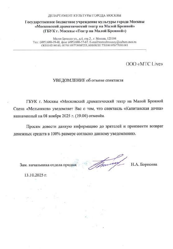 Уважаемый клиент! Спешим сообщить, что по информации, полученной от организатора, спектакль «Капитанская дочка», запланированный на 8 ноября 2025 года в 19:00 на сцене Мельников, отменен. Деньги за электронные билеты вернутся автоматически в полном объёме на карту, с которой была произведена оплата. Если вы купили билет в кассе Ticketland.ru за наличный расчет, то обратитесь, пожалуйста, на почту: vozvrat@ticketland.ru. С уважением, команда поддержки Ticketland