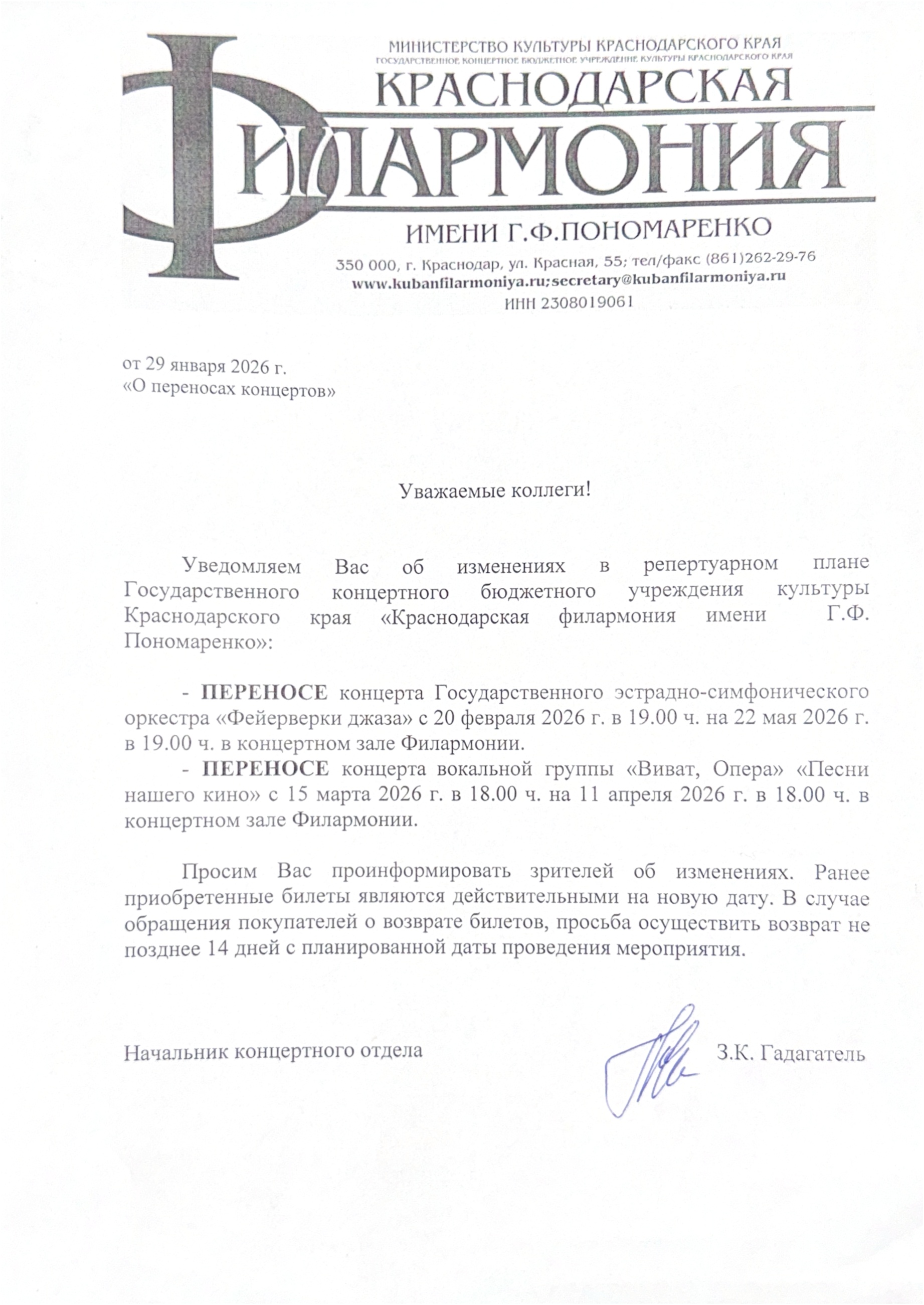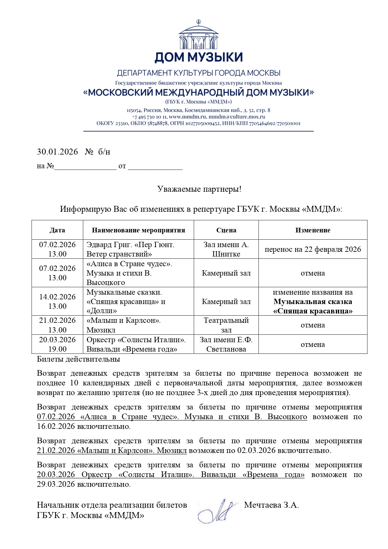 Уважаемый клиент! Спешим сообщить, что по информации, полученной от организатора, концерт «Большой джазовый оркестр. Караван. Джингл Беллс. Щелкунчик» запланированный на 8 февраля 2026 года в 14:00 в театральном центре «На Плющихе», заменен на концерт Большого джазового оркестра «Битлз. Гленн Миллер. Джордж Гершвин». Начало в 19:00. Ранее приобретенные билеты действительны, обменивать их не нужно. Если вы не хотите посетить новое мероприятие, вернуть билет можно по кнопке в личном кабинете во вкладке «Заказы». Деньги за электронные билеты вернутся автоматически в полном объёме на карту, с которой была произведена оплата. Если вы купили билет в кассе Ticketland.ru за наличный расчет, то обратитесь, пожалуйста, на почту: vozvrat@ticketland.ru. Письмо от организатора С уважением, команда поддержки Ticketland