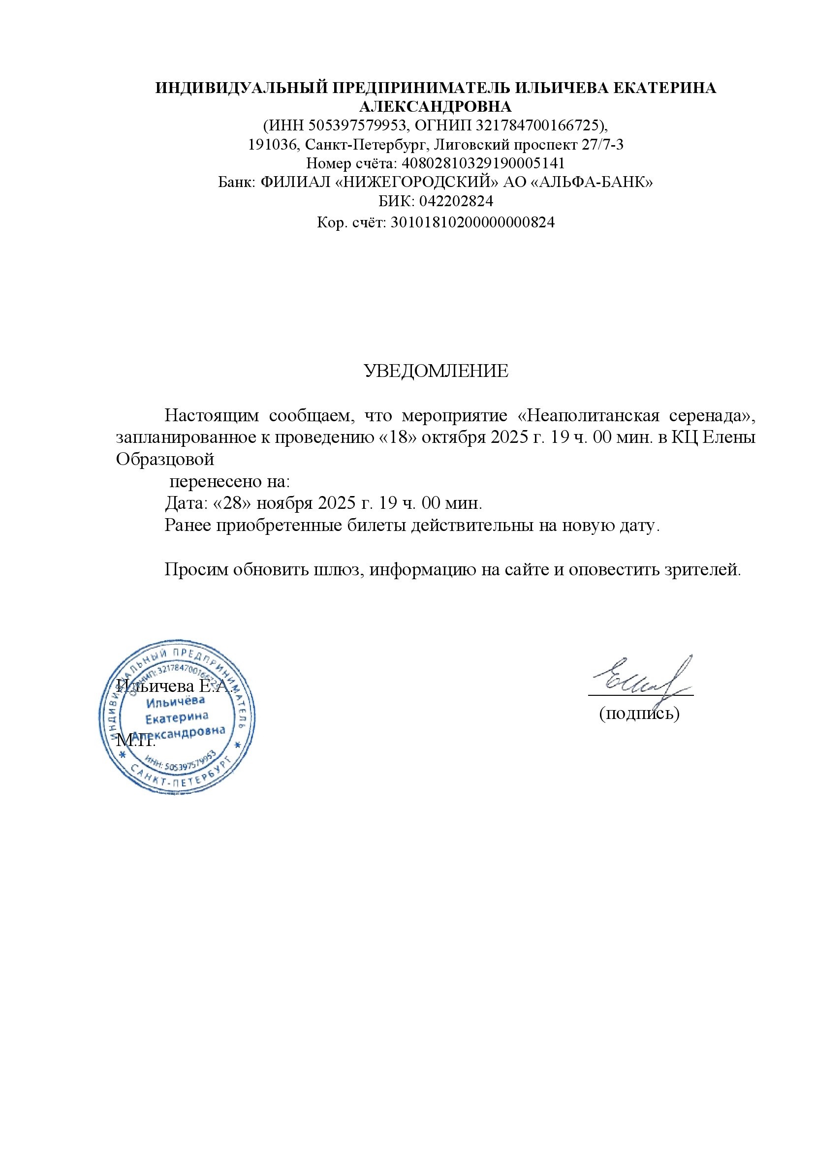 Уважаемый клиент! Спешим сообщить, что по информации, полученной от организатора, концерт «Неаполитанская серенада», запланированный на 18 октября 2025 года в 19:00 в КЦ Елены Образцовой, перенесен на 28 ноября 2025 года. Ранее приобретенные билеты действительны на новую дату, обменивать их не нужно. Если вам не удобно посетить мероприятие в новую дату, вы можете вернуть билет по кнопке в личном кабинете во вкладке «Заказы». Деньги за электронные билеты вернутся автоматически в полном объёме на карту, с которой была произведена оплата. Если вы купили билет в кассе Ticketland.ru за наличный расчет, то обратитесь, пожалуйста, на почту: vozvrat@ticketland.ru. Письмо от организатораС уважением, команда поддержки Ticketland