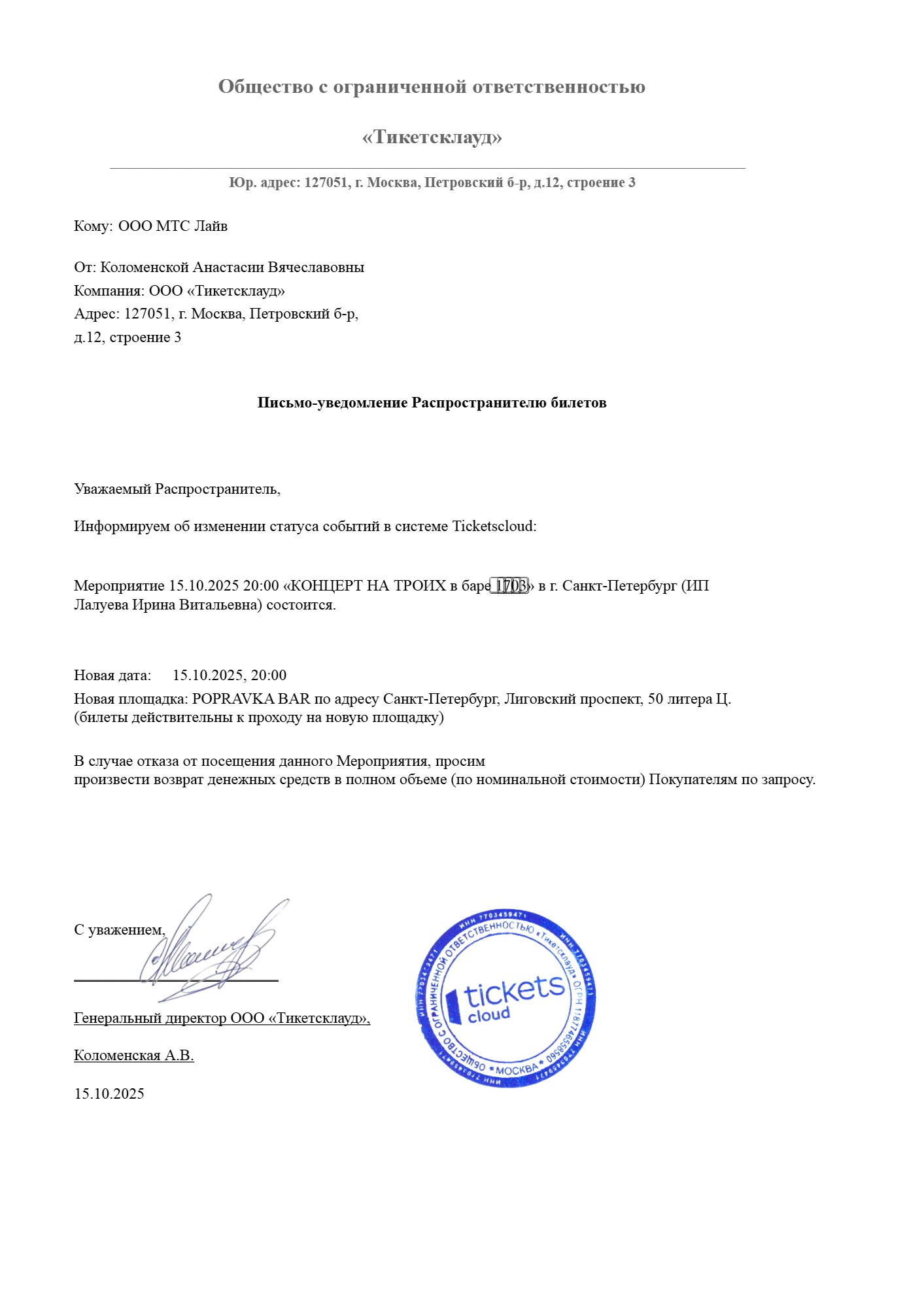 Уважаемый клиент! Спешим сообщить, что по информации, полученной от организатора, Концерт на троих в баре «1703», запланированный на 15 октября 2025 года в 20:00 в баре «1703», перенесен. Новая площадка: Popravka Bar по адресу Санкт-Петербург, Лиговский проспект, 50 литера Ц. Ранее приобретенные билеты действительны, обменивать их не нужно. Если вы не хотите посетить новое мероприятие, вернуть билет можно по кнопке в личном кабинете во вкладке «Заказы». Деньги за электронные билеты вернутся автоматически в полном объёме на карту, с которой была произведена оплата. Если вы купили билет в кассе Ticketland.ru за наличный расчет, то обратитесь, пожалуйста, на почту: vozvrat@ticketland.ru. С уважением, команда поддержки Ticketland.