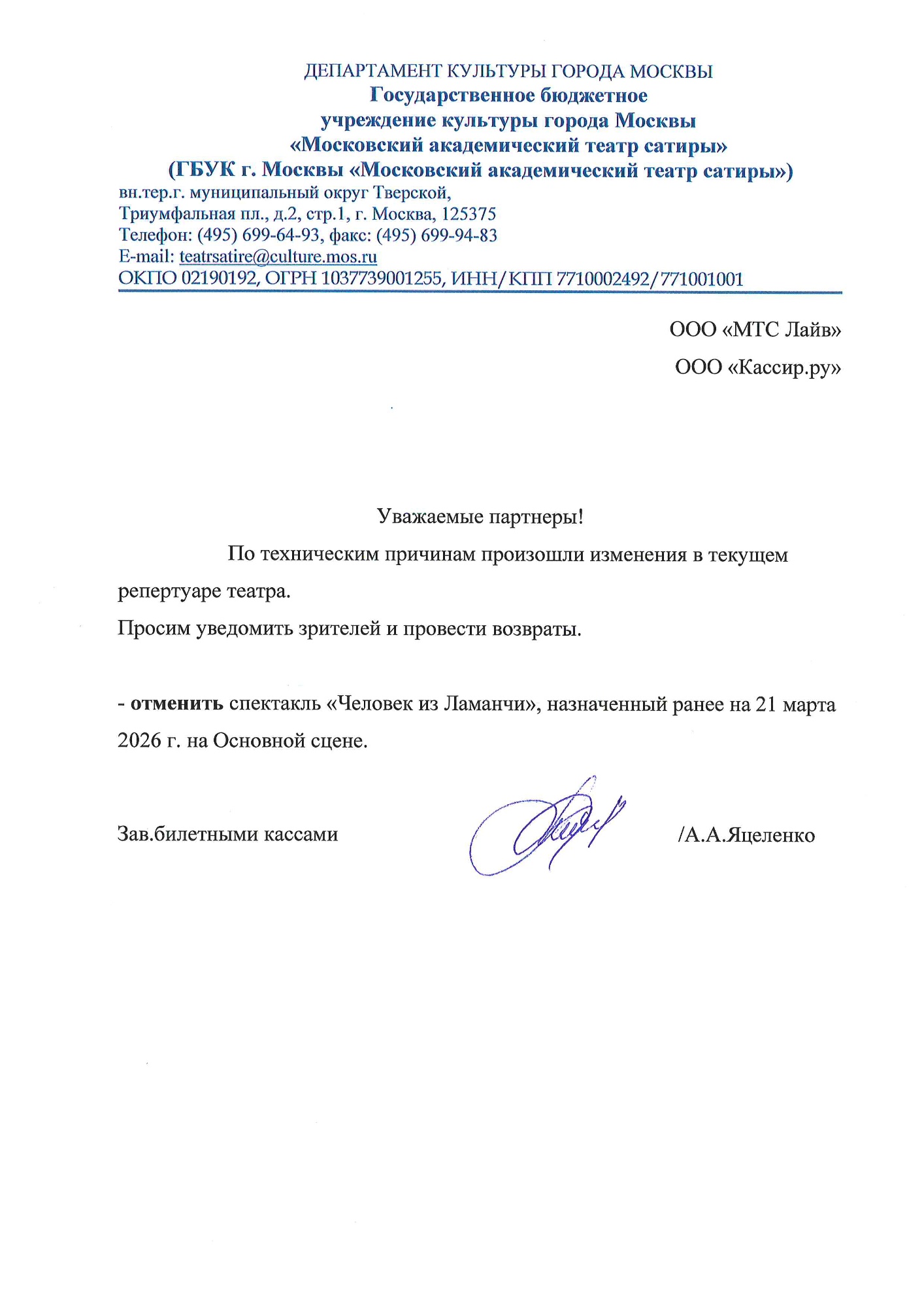 Уважаемый клиент! Спешим сообщить, что по информации, полученной от организатора, спектакль «Человек из Ламанчи», запланированный на 21 марта 2026 года в 19:00 в театре Сатиры, отменен. Деньги за электронные билеты вернутся автоматически в полном объёме на карту, с которой была произведена оплата. Если вы купили билет в кассе Ticketland.ru за наличный расчет, то обратитесь, пожалуйста, на почту: vozvrat@ticketland.ru. С уважением, команда поддержки Ticketland.