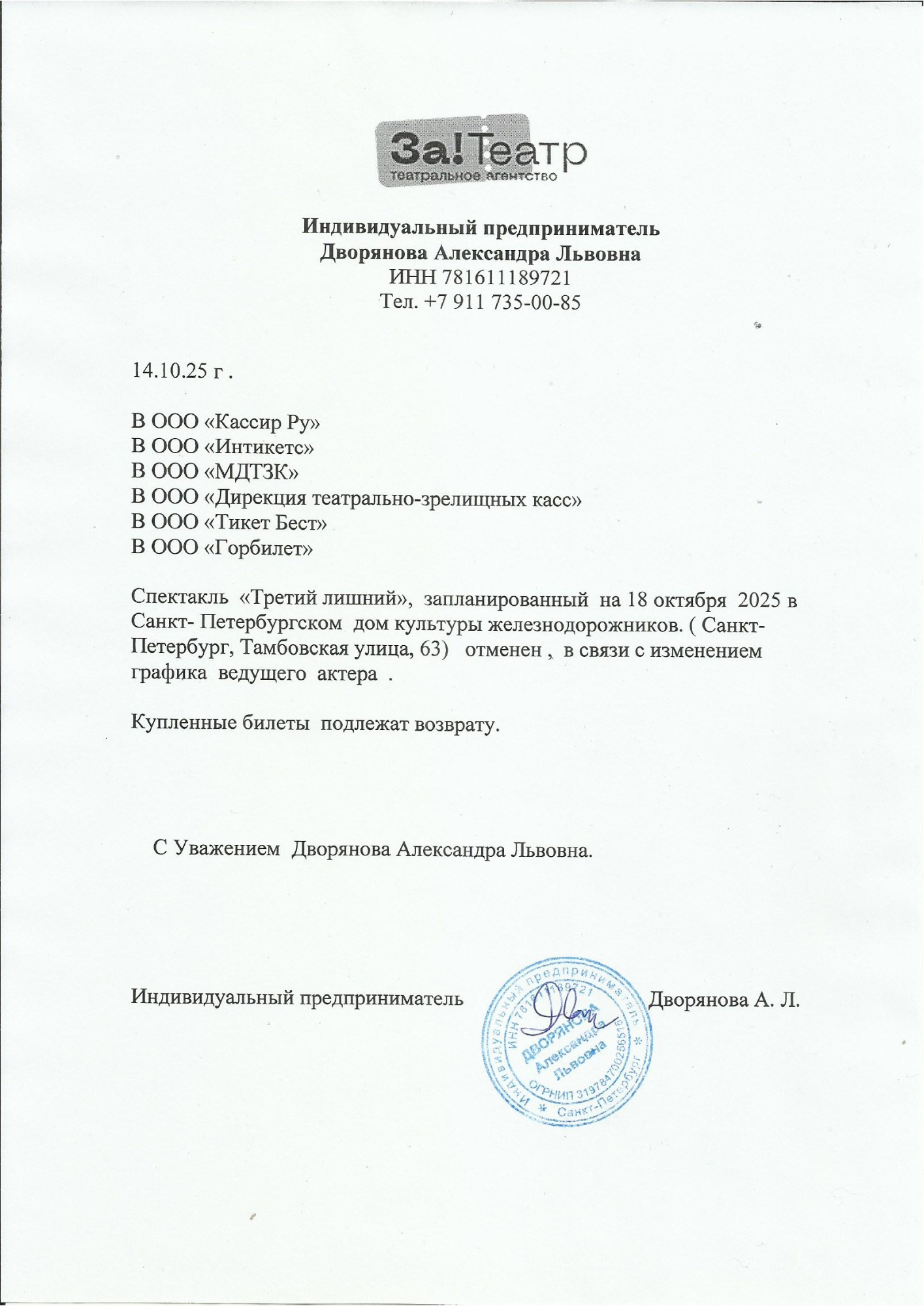 Уважаемый клиент! Спешим сообщить, что по информации, полученной от организатора, спектакль «Третий лишний», запланированный на 18 октября 2025 года в 19:00 в ДК Железнодорожников, отменён. Деньги за электронные билеты вернутся автоматически в полном объёме на карту, с которой была произведена оплата. Если вы купили билет в кассе Ticketland.ru за наличный расчет, то обратитесь, пожалуйста, на почту: vozvrat@ticketland.ru. С уважением, команда поддержки Ticketland