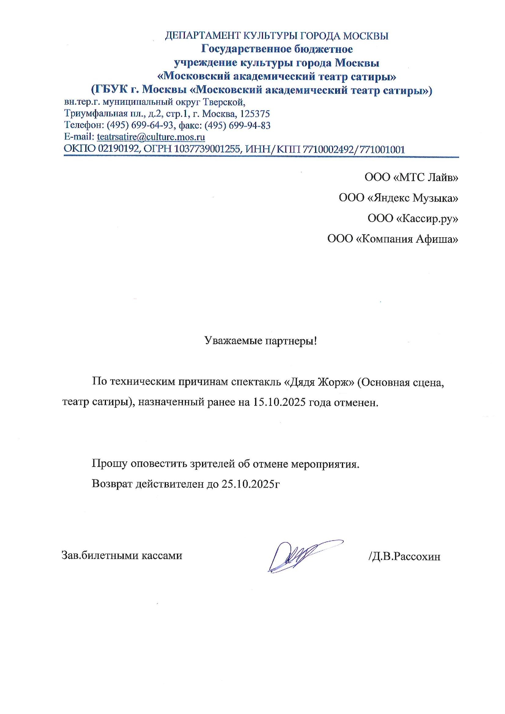 Уважаемый клиент! Спешим сообщить, что по информации, полученной от организатора, спектакль «Дядя Жорж», запланированный на 15 октября 2025 года в 19:00 в театре Сатиры, отменён. Деньги за электронные билеты вернутся автоматически в полном объёме на карту, с которой была произведена оплата. Если вы купили билет в кассе Ticketland.ru за наличный расчет, то обратитесь, пожалуйста, на почту: vozvrat@ticketland.ru. Письмо от организатораС уважением, команда поддержки Ticketland.
