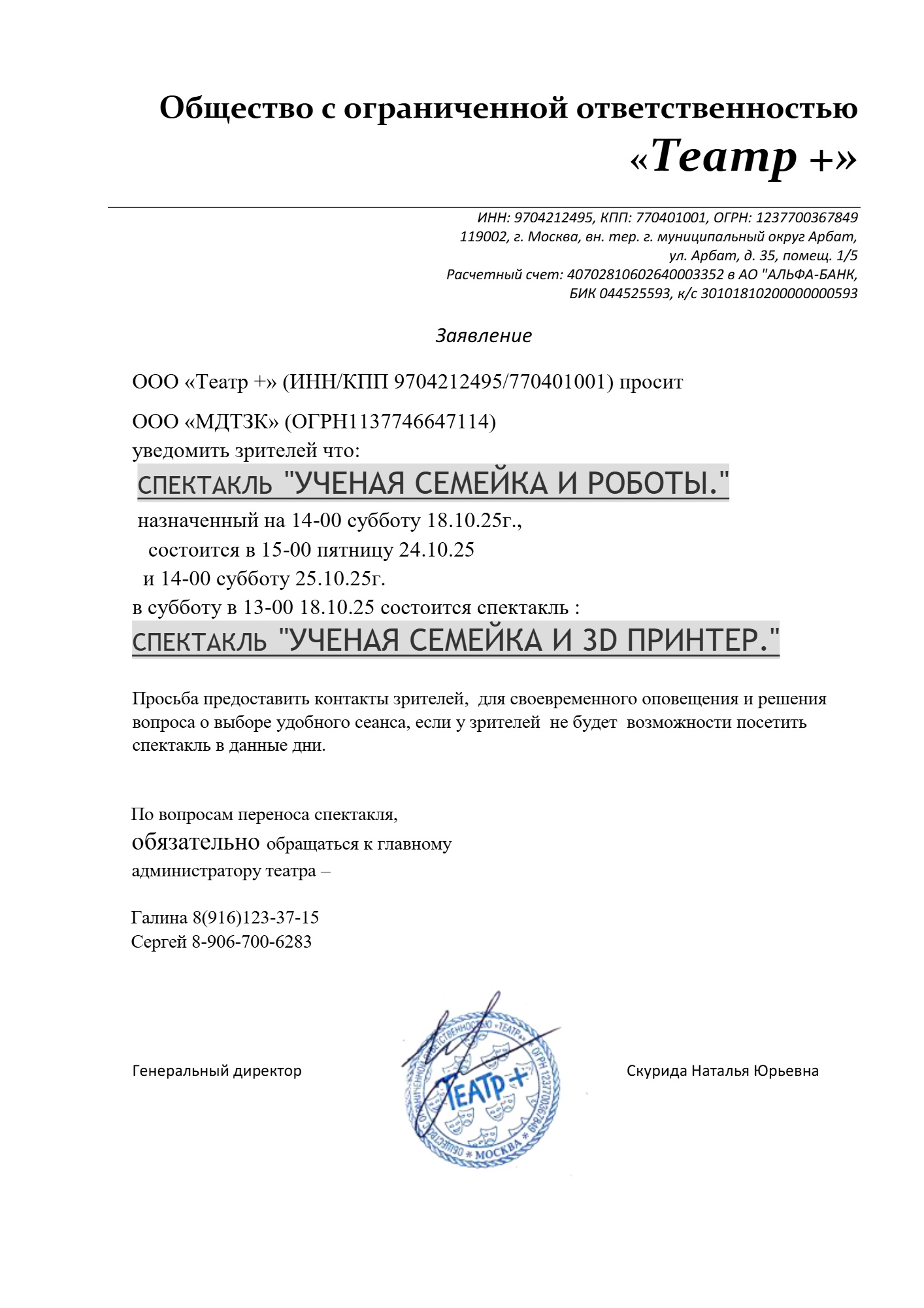 Уважаемый клиент! Спешим сообщить, что по информации, полученной от организатора, спектакль «Учёная семейка и роботы», запланированный на 18 октября 2025 года 14:00 в Центральном доме актера, перенесен на 24 октября в 15:00 и 25 октября в 14:00. Организатор предлагает выбрать любой из сеансов в этоти дни. По всем вопросам обращайтесь, пожалуйста, к организатору по следующим контактным данным: Галина +7 (916)123-37-15, Сергей +7 (906) 700-62-83. С уважением, команда поддержки Ticketland