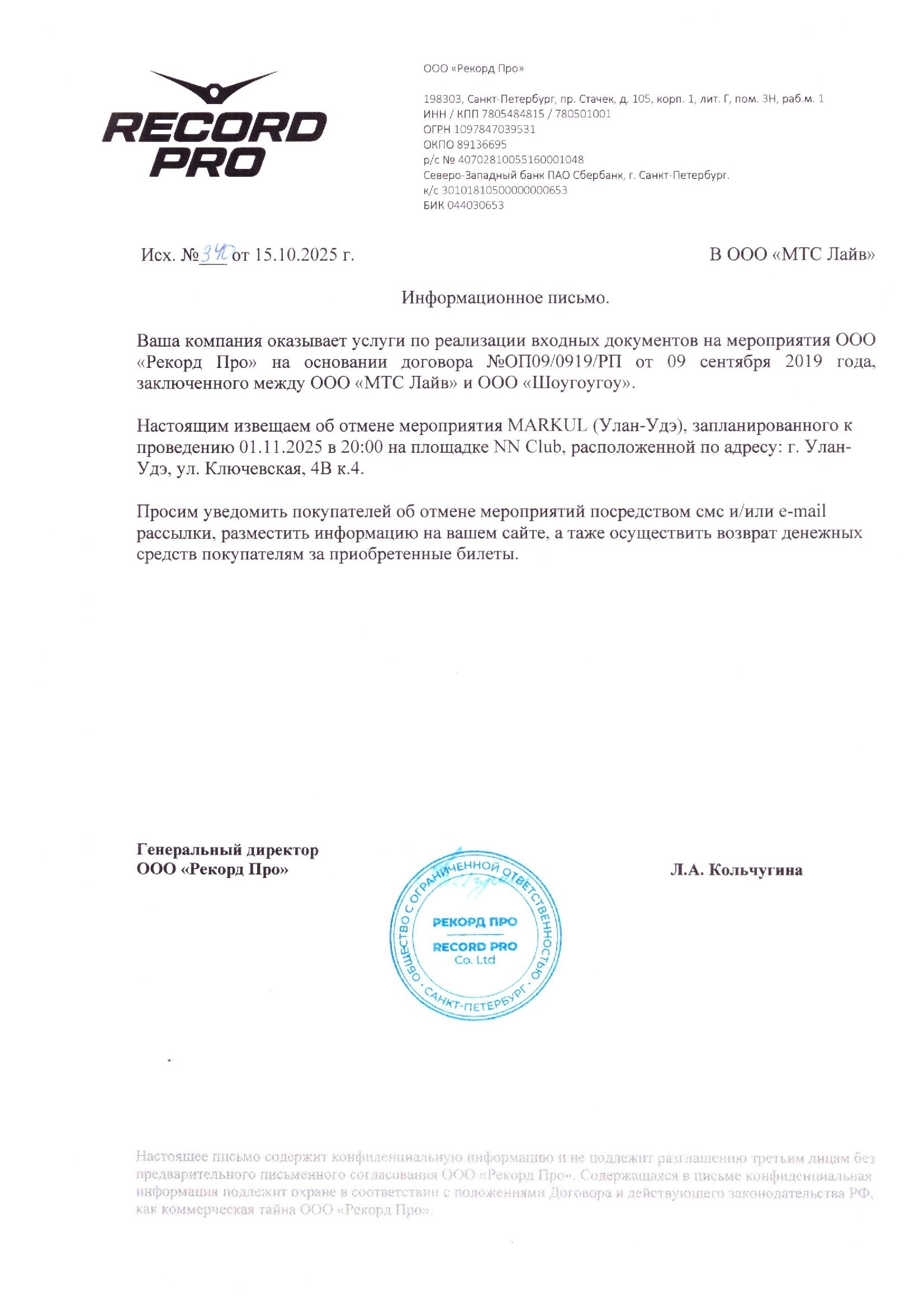 Уважаемый клиент! Спешим сообщить, что по информации, полученной от организатора, концерт Markul, запланированный на 1 ноября 2025 года в 20:00 в клубе «Rooms», отменён. Деньги за электронные билеты вернутся автоматически в полном объёме на карту, с которой была произведена оплата. Если вы купили билет в кассе Ticketland.ru за наличный расчет, то обратитесь, пожалуйста, на почту: vozvrat@ticketland.ru. С уважением, команда поддержки Ticketland.