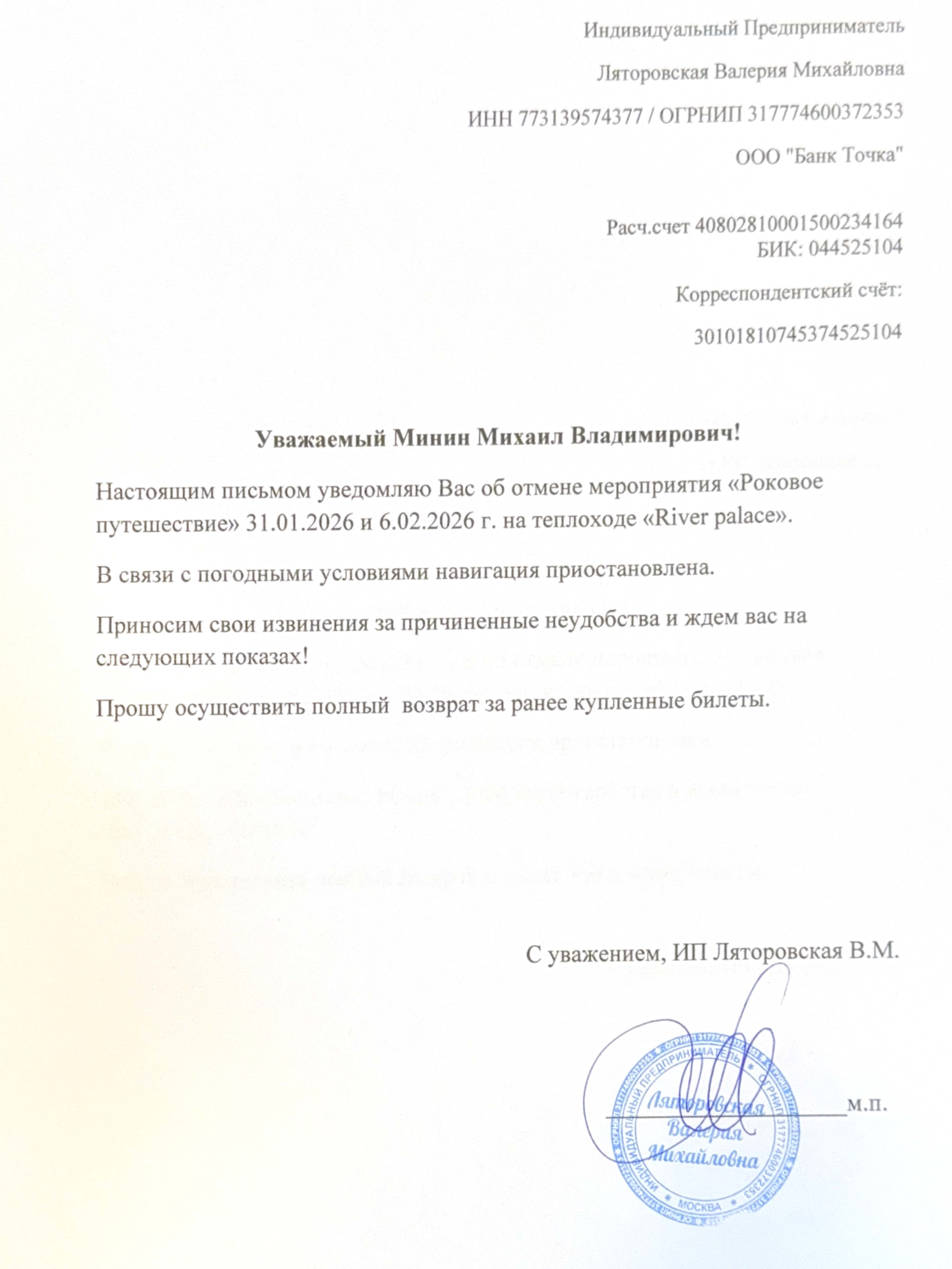 Уважаемый клиент! Спешим сообщить, что по информации, полученной от организатора, сеансы спектакля «Роковое путешествие», запланированные на 31 января и 6 февраля 2026 года в 18:50 на Теплоходе «River palace», отменены. Деньги за электронные билеты вернутся автоматически в полном объёме на карту, с которой была произведена оплата. Если вы купили билет в кассе Ticketland.ru за наличный расчет, то обратитесь, пожалуйста, на почту: vozvrat@ticketland.ru. С уважением, команда поддержки Ticketland.
