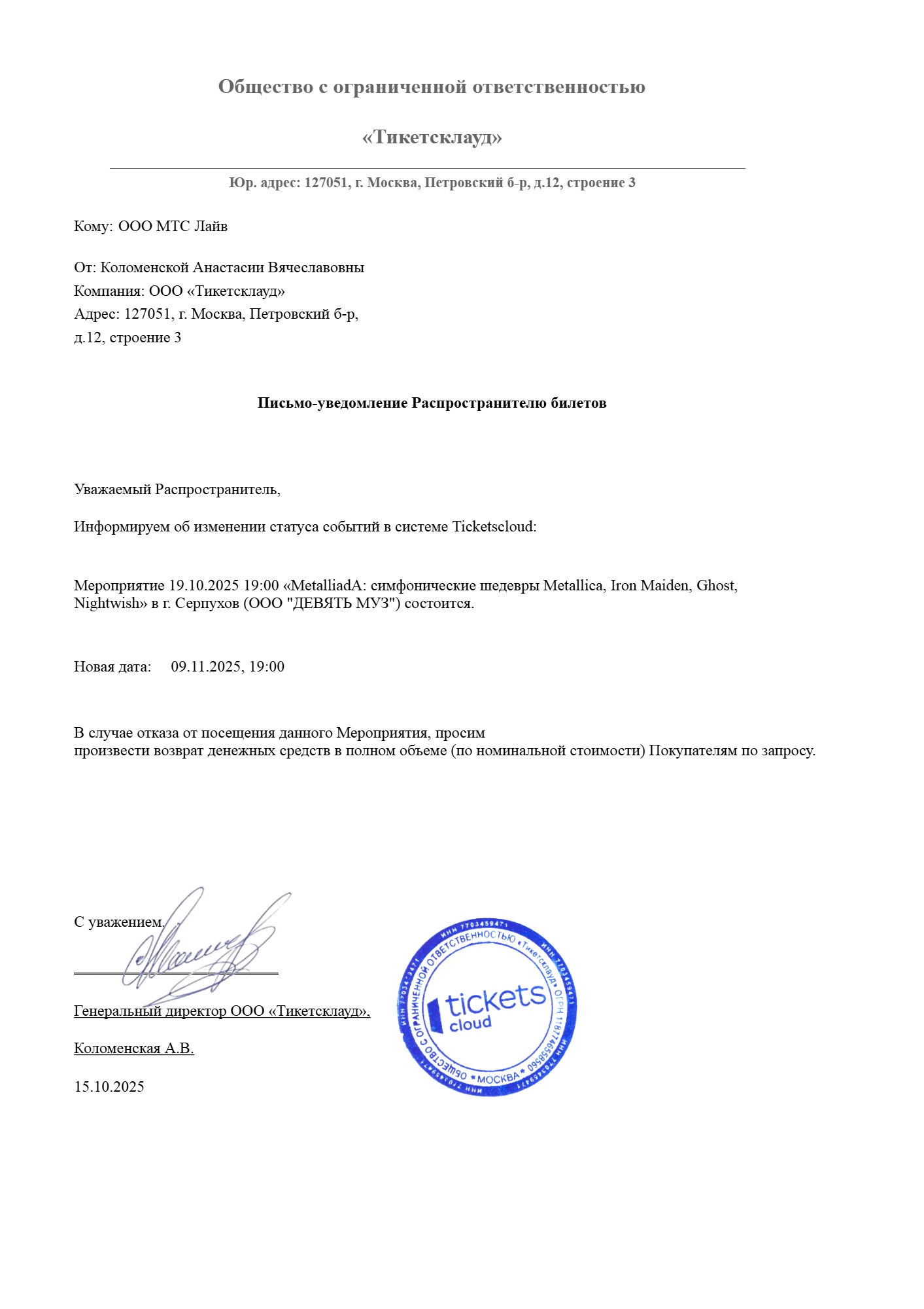 Уважаемый клиент! Спешим сообщить, что по информации, полученной от организатора, концерт «MetalliadA: симфонические шедевры Metallica, Iron Maiden, Ghost, Nightwish», запланированный на 19 октября 2025 года в 19:00 в ДК им. В.И. Ленина (Серпухов), перенесён на 9 ноября 2025 года, начало в 19:00. Ранее приобретенные билеты действительны на новую дату, обменивать их не нужно. Если вам не удобно посетить мероприятие в новую дату, вы можете вернуть билет по кнопке в личном кабинете во вкладке «Заказы». Деньги за электронные билеты вернутся автоматически в полном объёме на карту, с которой была произведена оплата. Если вы купили билет в кассе Ticketland.ru за наличный расчет, то обратитесь, пожалуйста, на почту: vozvrat@ticketland.ru. С уважением, команда поддержки Ticketland.